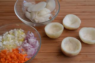 - Snijd de champignons en de sjalot in kleine stukjes. Bak ze in boter tot de sjalot glazig is. Kruid met peper en zout.