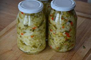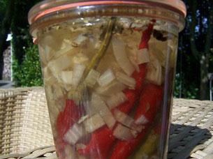 - Schep de chutney mbv een schuimspaan in gesteriliseerde jampotten. Vul de jampotten zo hoog mogelijk en schep met een lepel de kokende azijn over de groenten zodat de jampot tot de rand gevuld is. Sluit de jampotten met de deksel, zet ze of de kop gedurende 5 minuten, draai ze om en laat de chutney minstens 2 weken trekken voordat u ze opent.