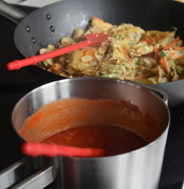 - Meng de slagroom met de tomatenpuree, het citroensap en de fijngesneden peterselie. Kruid met wat peper en zout. Breng dit mengsel onder voortdurend roeren aan de kook. Laat de saus kort doorkoken.
