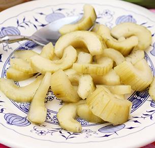 - Voeg de schijfjes komkommer, piment en kruidnagels toe. Laat het mengsel niet meer koken maar 1 minuut verwarmen en vul goed uitgekookte jampotten met het hete mengsel.