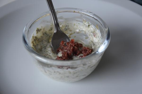 - Pel 2 teentjes look. Plet de look samen met het zeezout, zorg dat je een gladde saus bekomt. (Doet dit in een blender of met een vijzel). Voeg de paprikapoeder, komijnpoeder, koriander en citroensap toe en meng het geheel. Roer goed en voeg stapsgewijs de olijfolie toe.