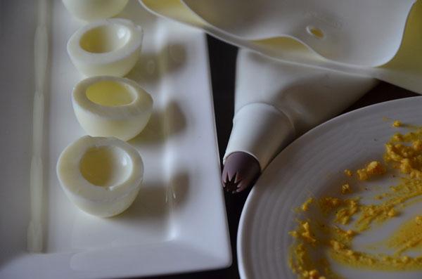 - Om ervoor te zorgen dat uw eieren blijven staan snijd u eerst met een mesje aan de onderkant het ei een klein beetje weg. Vul de spuitzak met het eigeelmengsel en vul de eieren op.