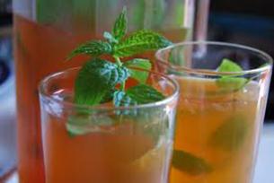 - Breng de limoenen, het limoensap en de gember met 700 ml water en de kandijsuiker aan de kook. Voeg de theeblaadjes in een thee-ei en de takjes munt toe. Laat de siroop een zacht vuurtje 5-7 minuten trekken.