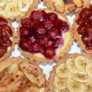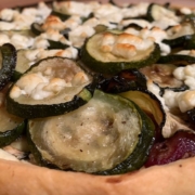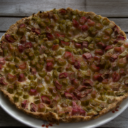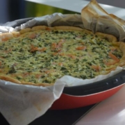 Quiche van gerookte zalm, courgette, ui en tomaten