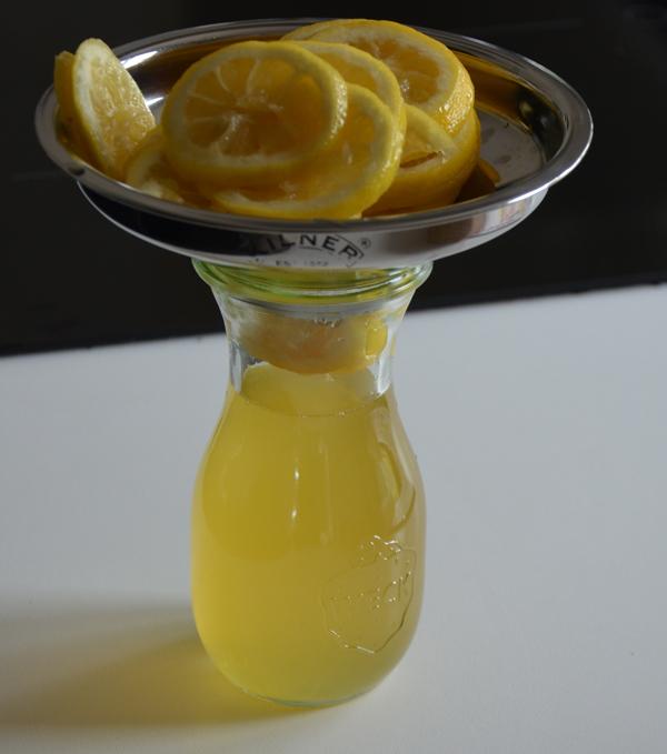 - Zeef de gearomatiseerde alcohol met behulp van een neteldoek. Vang de alcohol op en gooi de citroenschillen weg.