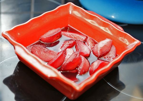 • Schil de peren en verwijder de klokhuizen. Snijd de peren in vieren en voeg ze toe aan de wijn.