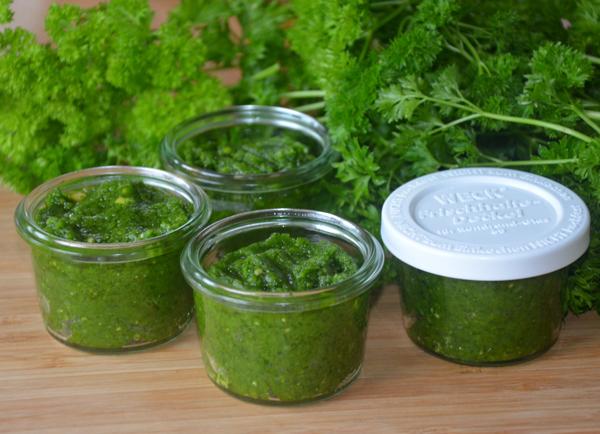 Altijd heerlijk peterseliepesto. Ik heb de pesto deze keer gemaakt met ruwe cashewnoten ipv pijnboompitten. Ons recept resulteert in 4 weckpotjes van 80 ml.