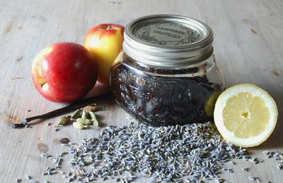 - Doe de appelstukjes samen met het citroensap en de gedroogde lavendelbloemen in een kookpot en zet alles net onder water.