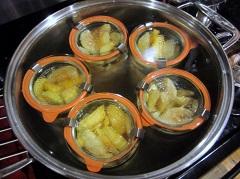 - Breng de suikersiroop weer aan de kook en giet deze met behulp van een trechter in de weckpotten. Sluit de weckpotten af met de inmaakringen, deksels en klemmen en weck de appelsiroop in een inmaakketel of pan op 90 graden gedurende 30 minuten. Wij hebben een pan gebruikt omdat onze inmaakketels vol staan. Gebruik als u een pan gebruikt een thermometer om de temperatuur in de gaten te houden.