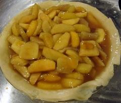 - Leg de appels dakpansgewijs in de vlaaivorm. (zie foto) Besrtooi de appels in de vorm met 25 gram suiker en werk af met kaneel.