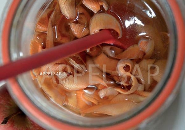 - Doe de gedroogde appelschillen in een grote glazen pot en zet ze net onder water. Laat de pot 4 tot 6 uur in de koelkast staan en zeef het appelsap. Voeg eventueel wat honing toe.