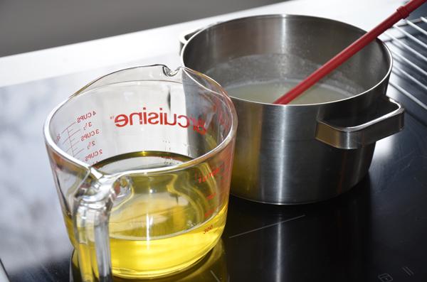 Verhit 2 eetlepels kruidenolie in een pan en bak daar de fijngesneden knoflookteentjes in. |