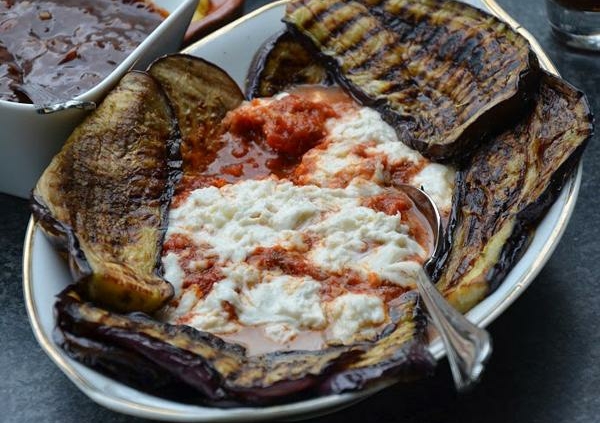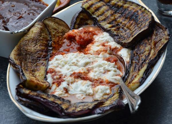 - Serveer de plakjes gegrilde aubergine overgoten met de tomatensaus. Verkruimel de mozzarella over de saus.