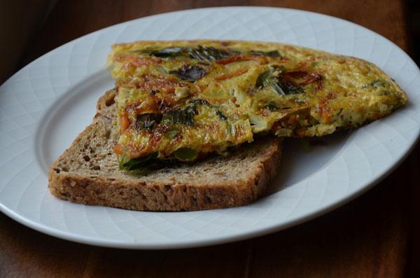 - Voeg de gebakken groenten bij de eieren en roer goed om.