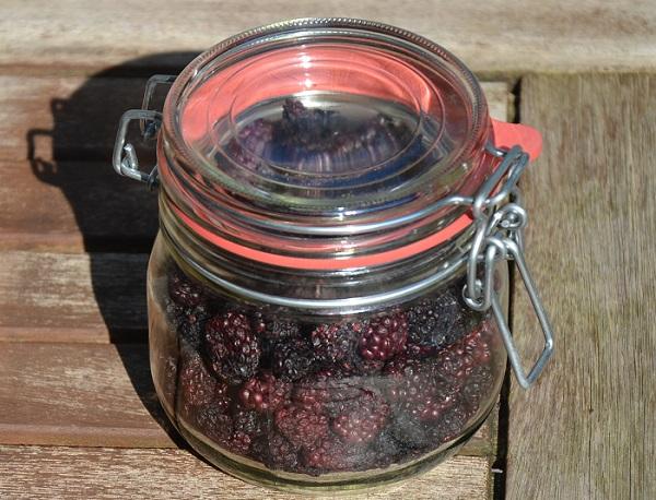 - Bewaar de gedroogde bramen in het donker in een glazen bewaarpot of jampot die goed droog is.