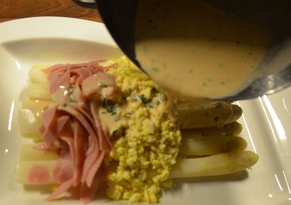 - Serveer de gekookte asperges met de fijngehakte eieren, de fijngesneden ham en de saus.