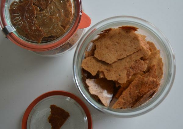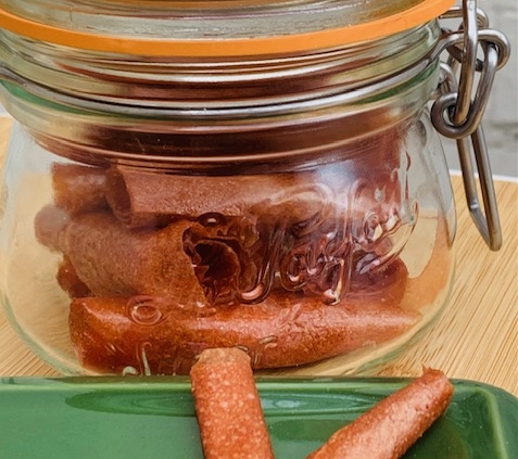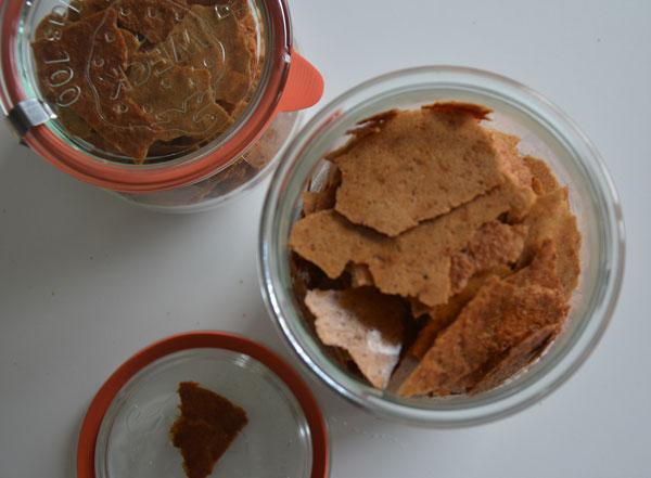 - Haal de lades uit de droger en laat het fruitleer afkoelen. Mijn fruitleer heb ik laten drogen tot het hard en lekker knapperig was. Daarna heb ik het fruitleer in stukken gebroken en in zuivere weckpotten gedaan maar u kunt natuurlijk ook gebruik maken van andere potten.