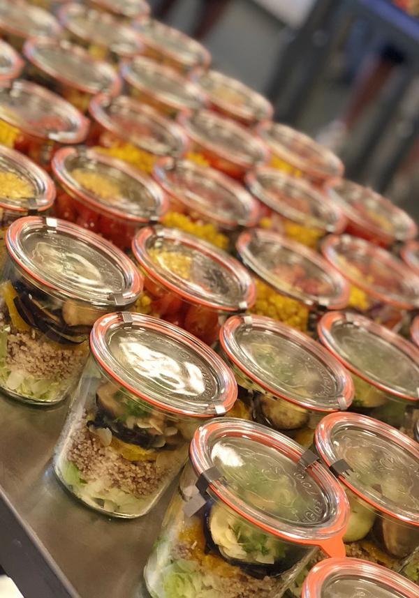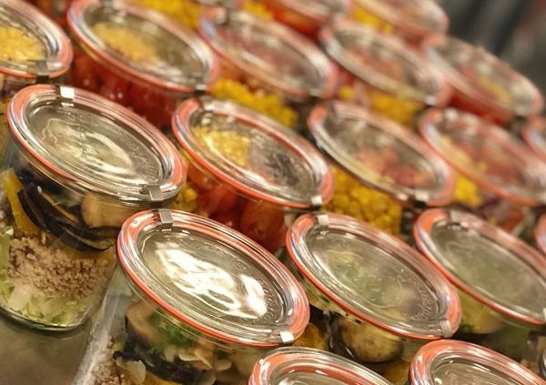- Snijd ondertussen de cake. Snijd voor elke weckpot 1 dikke plak en snijd deze in grote blokjes. Verdeel de cakeblokjes over de 3 weckpotten. Besprenkel de cake met de rum.