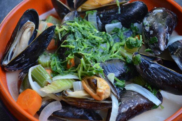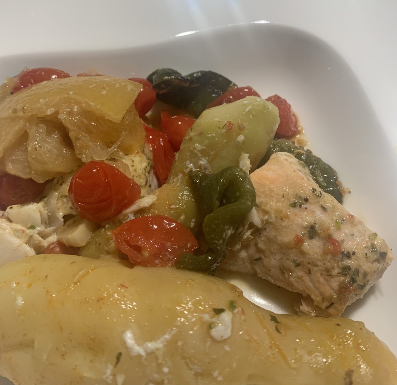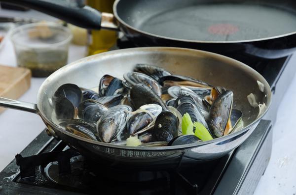 - Vul de sudderpan/tajine: - krielaardappelen op de bodem - 3/4 van de kerstomaten met paprika over de aardappelen - kabeljauw en zalm - de overige kerstomaten met paprika over de vis schikken - olijven - ingelegde citroenen (Haal deze uit met een propere lepel, spoel af en snijd in stukjes) - water Giet olijfolie over het stoofpotje, dek af en laat 15 min pruttelen.