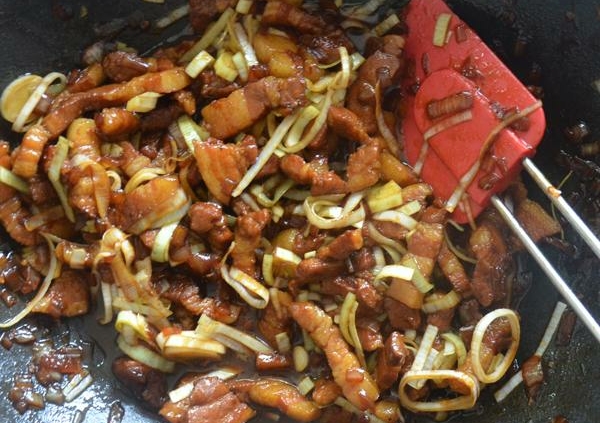 - Voeg het schaaltje met de basterdsuiker, sambal en ketchap toe en laat het vlees 15 minuten zachtjes stoven.