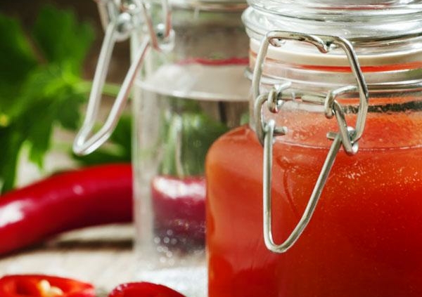 • Schep de hete chilisaus met behulp van een trechter in een pot of jampot. Sluit de pot en zet deze voor 10 minuten op z’n kop. Draai de pot terug om en laat de chilisaus afkoelen.