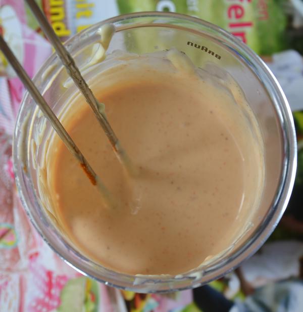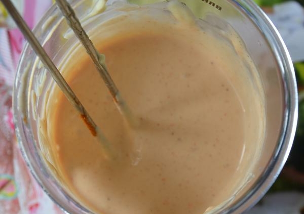 - Meng de mayonaise, tomatenketchup, paprikapoeder en de whiskey in een maatbeker. Ik gebruik altijd een maatbeker als de hoeveelheden in ml weergegeven staan in een recept maar u kunt natuurlijk ook een kommetje gebruiken.