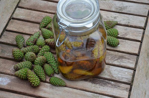 - Snijd de dennenappels doormidden, neem een grote weckpot en voeg alle ingrediënten toe. Sluit de weckpot af en laat de dennenappel siroop minimaal drie weken trekken. Schud elke week een keertje.
