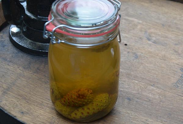 - Neem een grote pot met beugelsluiting en voeg alle ingrediënten toe. Sluit de pot af en laat de dennenappel likeur twee weken rusten. Schud elke week een keertje.