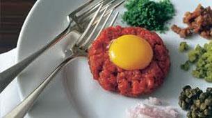 - Maak in het midden van het vlees een kuiltje. Breek een ei en laat het eiwit weglopen. Doe de eidooier in het kuiltje. Strooi de fijngehakte bladpeterselie over de filet americain.