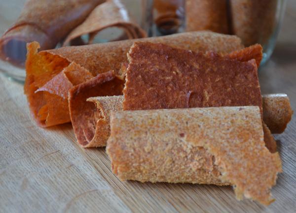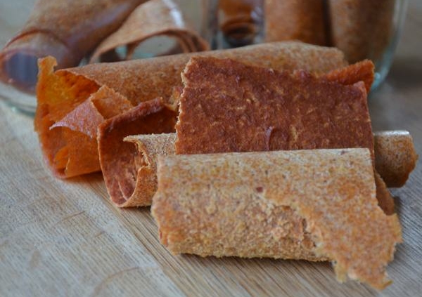 - Giet het appel-wortel mengsel op een paraflexx of droogsheet. Strijk het glad met een deegschraper tot een dikte van ongeveer 4 tot 7 mm.