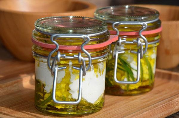 - Giet de afgekoelde olijfolie over de geitenkaas tot 0,5 cm onder de rand. Voeg het zeezout toe en sluit de weckpot goed af.
