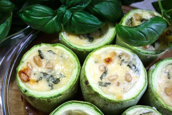 - Snijd de courgettes doormidden. Hol ze uit en bewaar het vruchtvlees. Pel en pers de knoflook fijn.