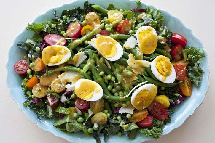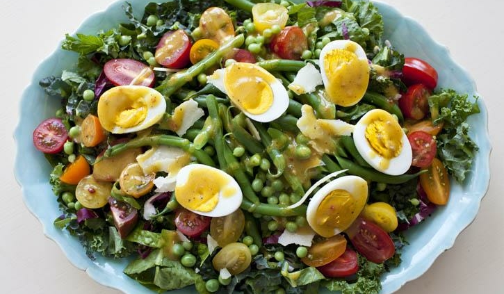 - Schep alles in een grote schaal en werk de salade af met de eieren en de dressing.