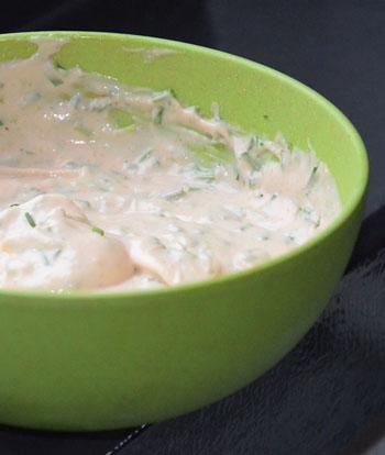 - Meng de mayonaise, tomatenketchup en het knoflookpoeder in een kommetje.
