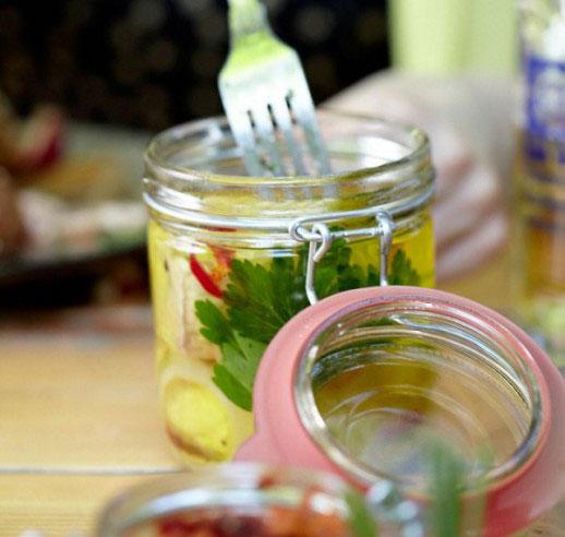 - Meng de olijfolie met de azijn. Giet het mengsel in de weckpot tot de kaas volledig onderstaat.
