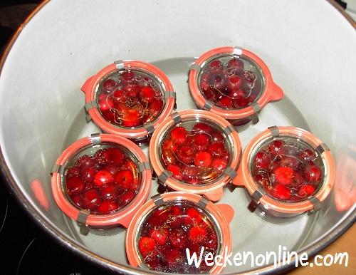 • Zet de weckpotten in een inmaakketel en zorg ervoor de hoogste pot in de inmaakketel voor minimaal 3/4 onder water staat. Weck de kersen gedurende 30 minuten op 90 graden.