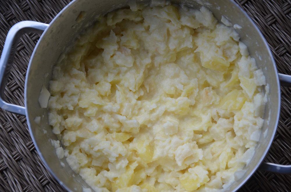 - Voeg de boter en de room toe. Voeg peper, zout en nootmuskaat naar smaak toe. Mix de puree met de deeghaken van een mixer om er een mooie ruwe knolselderpuree van te maken.