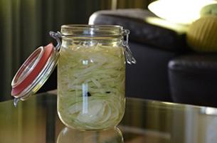 DE SAUS WECKEN?Vul gesteriliseerde weckpotten 1 cm onder de rand en weck de saus op 90 graden gedurende 30 minuten. |