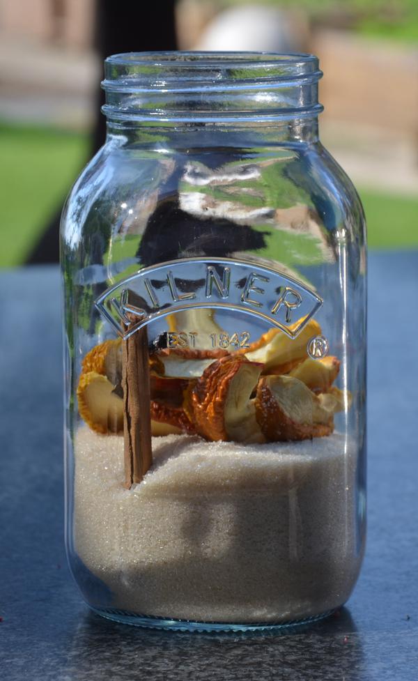 - Snijd de gedroogde appelpartjes doormidden. Doe de rietsuiker, vanillestokje, kaneelstokje, kruidnagel en gedroogde appelpartjes in de weckpot.