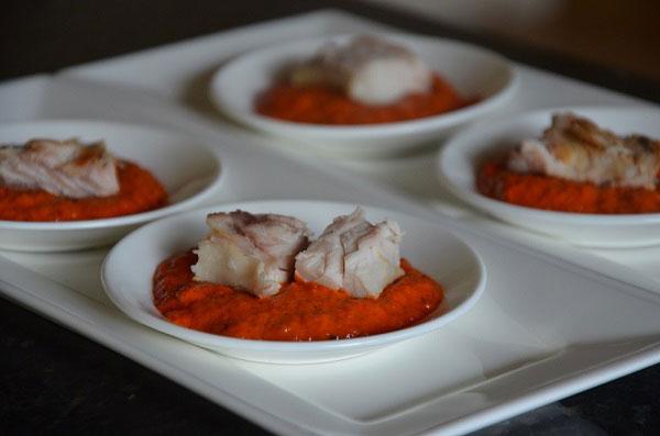 - Verwijder het vel en de graten van de makreel. Leg 2 kleine stukjes makreel bovenop de paprikacreme.