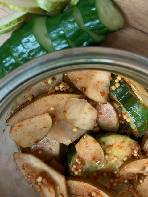 - Snijd de komkommer in blokjes en de radijsjes in schijfjes.