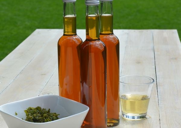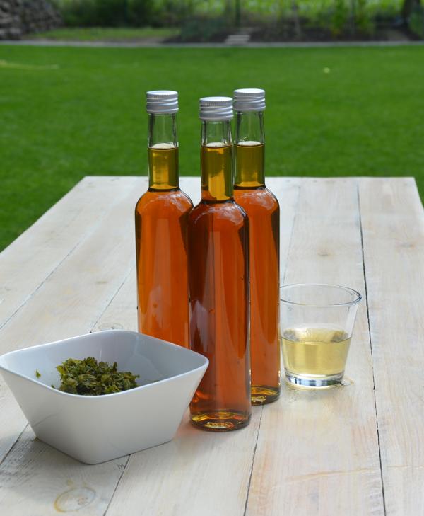 - Schep het grootste deel van de muntblaadjes uit de siroop met een schuimspaan. Zeef de muntsiroop en vul er de gesteriliseerde flessen mee. Ik doe dat altijd door in een flessentrechter een neteldoek te leggen. Sluit de flessen goed af.