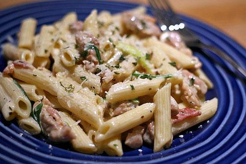 Penne met spekblokjes en een heerlijk romige knoflooksaus.