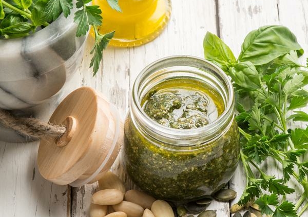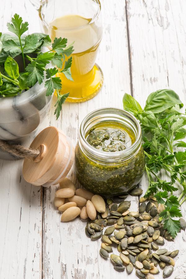 - Mix de basilicum, peterselie, pompoenpitten en pijnboompitten fijn in een keukenmachine, vijzel of blender.