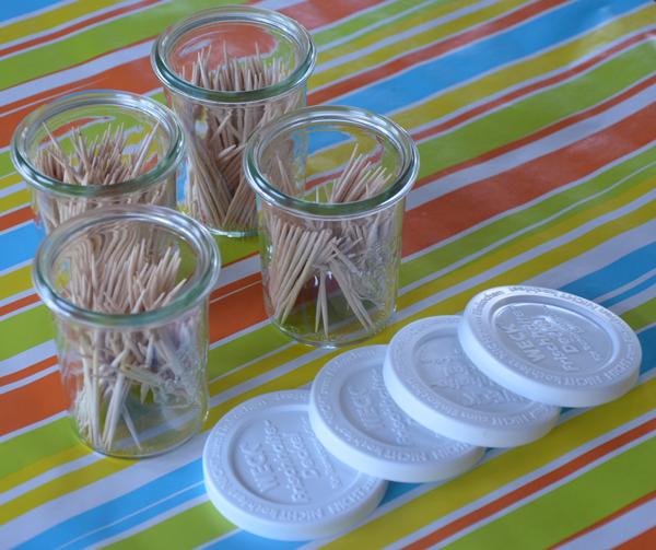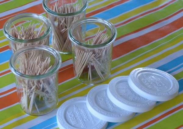 Een leuk idee voor weckpotjes: Bewaar en serveer er je prikkers in. Zet het weckpotje van 160 ml zonder vershouddeksel op tafel. Na gebruik sluit je het potje af met de vershouddeksel en kun je ze bewaren tot het volgende feestje. De gebruikte prikkers zijn de standaard prikkers, te koop in elke supermarkt.