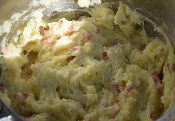 • Kook de aardappelen in gezouten water gedurende 20 minuten. Giet de aardappelen af en voeg de melk toe. Mix de aardappelen fijn.