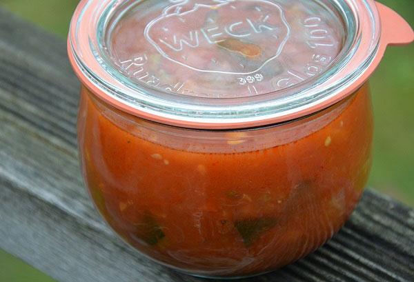 - Vul gesteriliseerde weckpotten tot 1 cm onder de rand met de ratatouille. Weck de weckpotten gedurende 120 minuten op 100 graden.