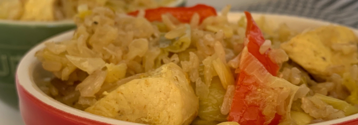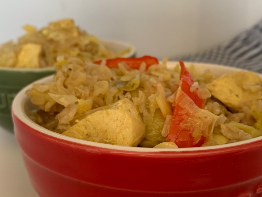 - Voeg de gekookte rijst door de kip en groenten en roer alles goed door elkaar.