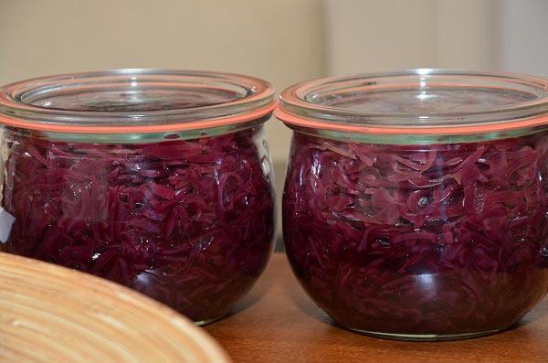 - Vul gesteriliseerde weckpotten zo vol mogelijk met de rode kool. Weck de weckpotten gedurende 120 minuten op 100 graden.