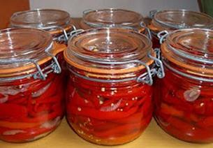 - Gebruik een schuimspaan om de rode pepers en de uien uit de kookpot te scheppen. Vul gesteriliseerde goed afsluitbare weckpotten met de rode pepers en de uien. Duw het goed aan.